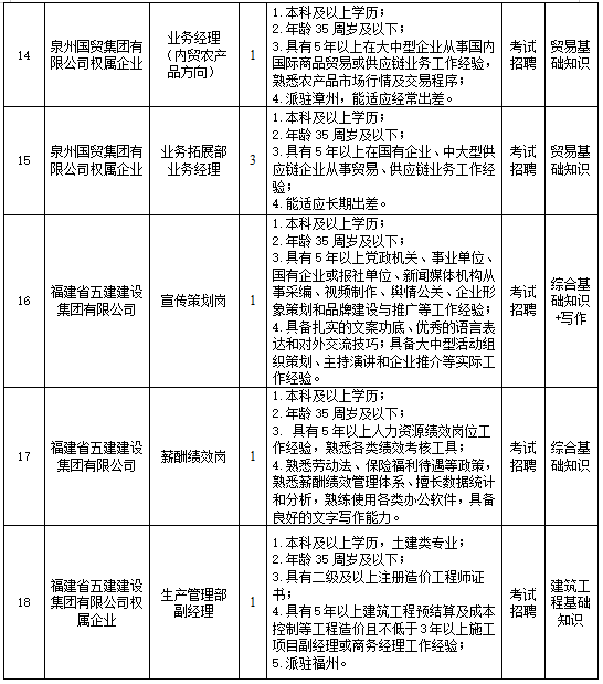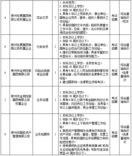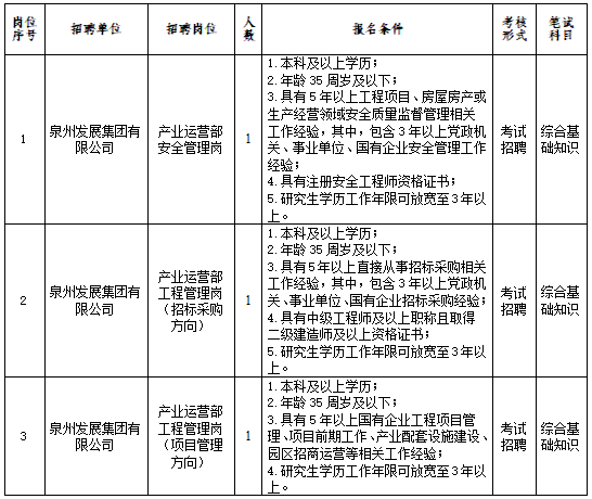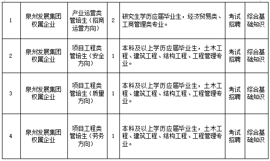 泉州发展集团权属企业本次面向应届毕业生招聘工作人员5名。具体岗位如下: