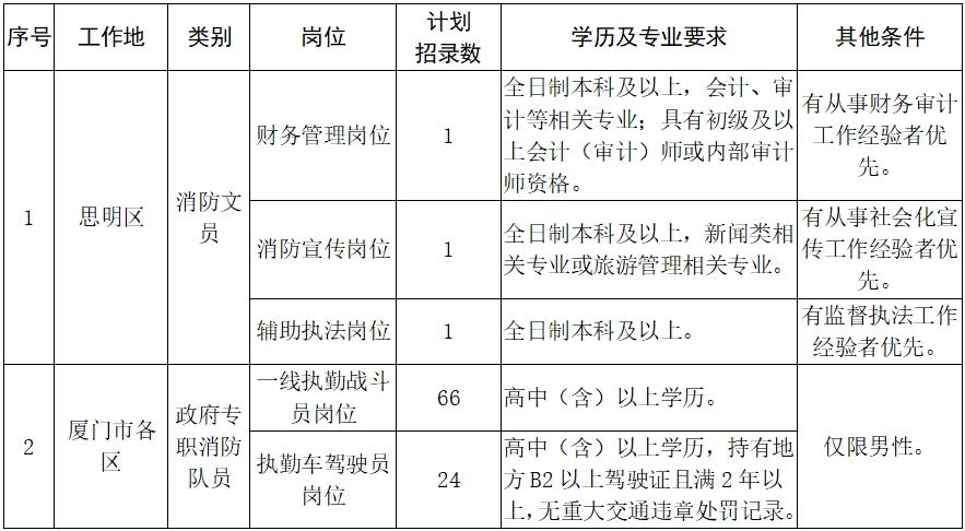 根据工作需要,厦门市消防救援支队现面向社会公开招聘政府专职消防员93名,现将有关招聘事项公告如下: