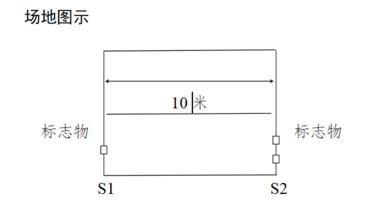 动作要求:受测试者采用站立式起跑,听到发令后从S1线外跑到S2线前(脚不得踩线)用手将竖立的木块推倒后折返,往返跑2次,每次推倒1个木块,第2次返回时冲出S1线。
