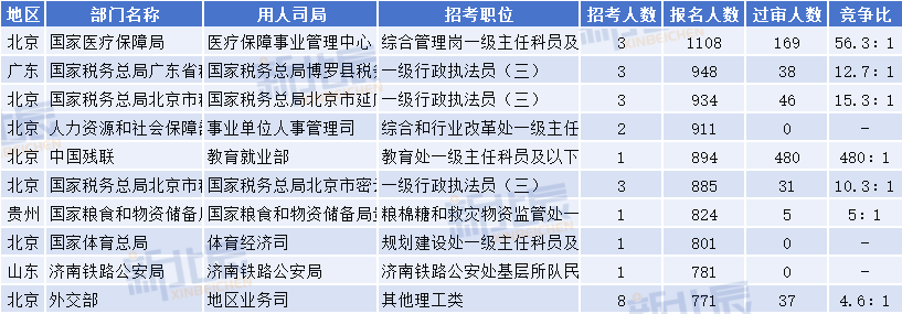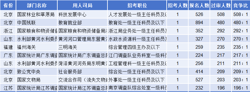 竞争比(过审人数 / 招考人数)是衡量岗位竞争激烈程度的核心指标,以下是竞争比最高的十大岗位: