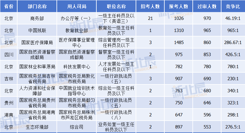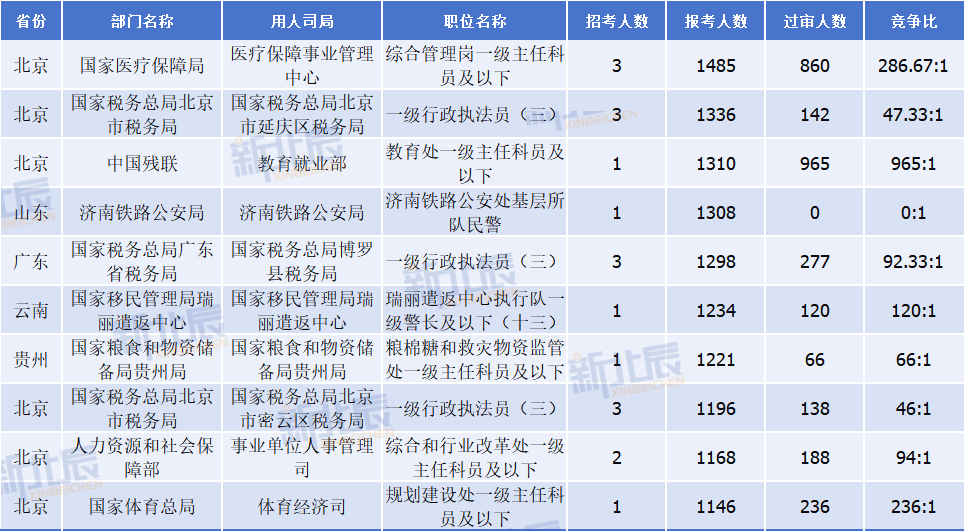 竞争比(过审人数 / 招考人数)是衡量岗位竞争激烈程度的核心指标,以下是竞争比最高的十大岗位:
