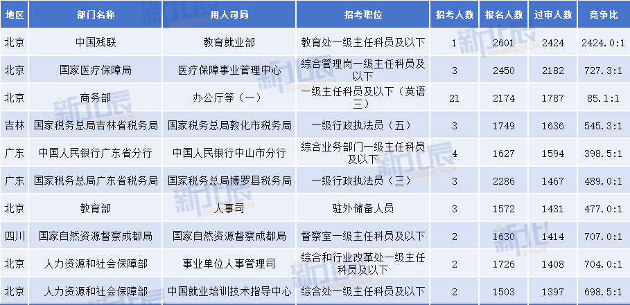 竞争比(过审人数 / 招考人数)是衡量岗位竞争激烈程度的核心指标,以下是竞争比最高的十大岗位: