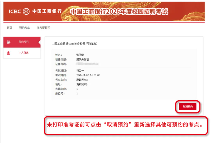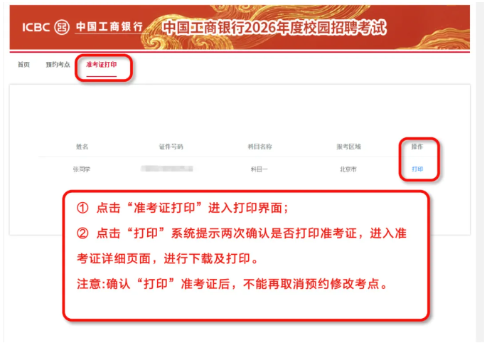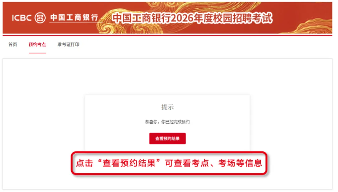 6. 考点预约及准考证打印通知已通过短信、邮件、工行招聘官网站内信渠道发送,请注意查收。更多信息请登录工行人才招聘官网( https://job.icbc.com.cn)查看《考生须知》;