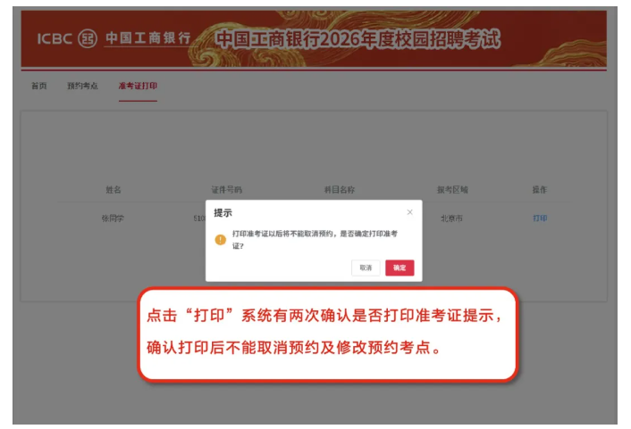 2. 打印准考证时点击“确定”按钮后,将不可修改考点预约结果;考生在准考证打印开放时间内可多次打印;