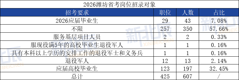 通过对潍坊地区职位表的统计,今年全市招考职位464个,招考647人,其中潍坊市公务员有364个职位,共招录541人;省直机关有22个职位,共招录23人,参公有61个职位,共招录66人。相比25年的786人减少139人。招考人数的减少,但是今年专科、往届生、定向招录都有岗位,大家可以放心根据自己的情况选择合理的岗位。