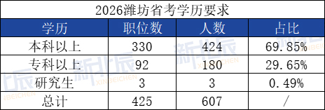 今年潍坊岗位中,专科岗位招180人,占总招考人数的29.65%;要求本科以上学历职位占总招考人数69.85%;要求研究生学历职位占总人数的0.49%。由此可见,相较去年今年本科岗位较去年相比有所增加;专科、研究生考生减少!