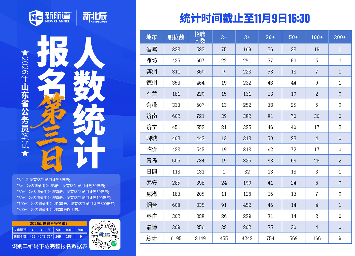 提示信息按照比例等级标识发布。“3-”为没有达到录用计划3倍的;“3+”为达到录用计划3倍、没有达到录用计划30倍的;“30+”为达到录用计划30倍、没有达到录用计划50倍的;“50+”为达到录用计划50倍、没有达到录用计划100倍的;“100+”为达到录用计划100倍、没有达到录用计划300倍的;“300+”为达到录用计划300倍以上的。