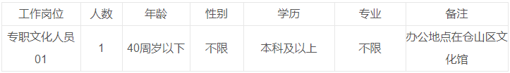 福州市仓山区文化体育和旅游局系仓山区政府直属机关单位。因单位工作需要,现面向社会招聘1名编外人员,并按照福州市仓山区编外人员管理规定,开展仓山区文化体育和旅游局编外人员招聘报名工作。现将招聘简章公告如下:
