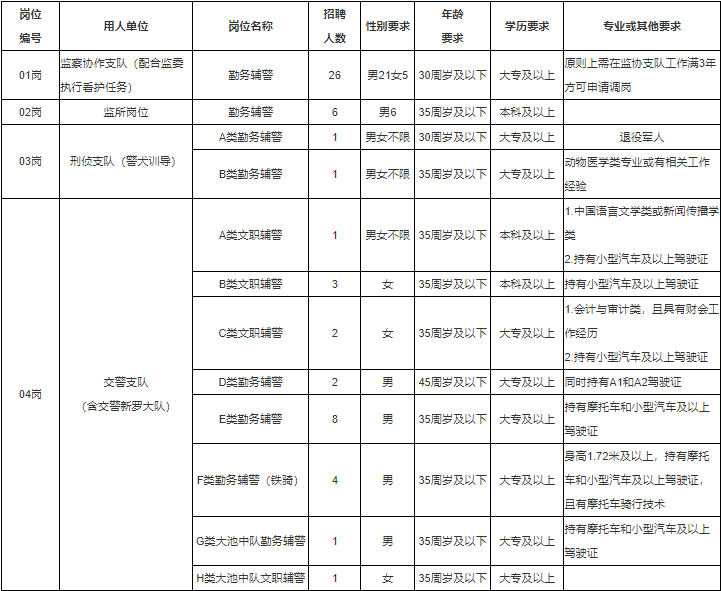 本次计划招聘辅警56名,具体招聘岗位及要求详见招聘岗位表。