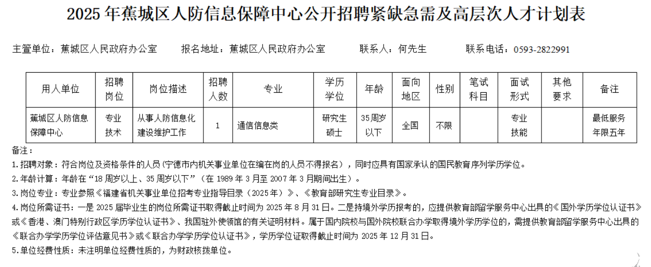 1. 2025年蕉城区人防信息保障中心公开招聘紧缺急需及高层次人才计划表