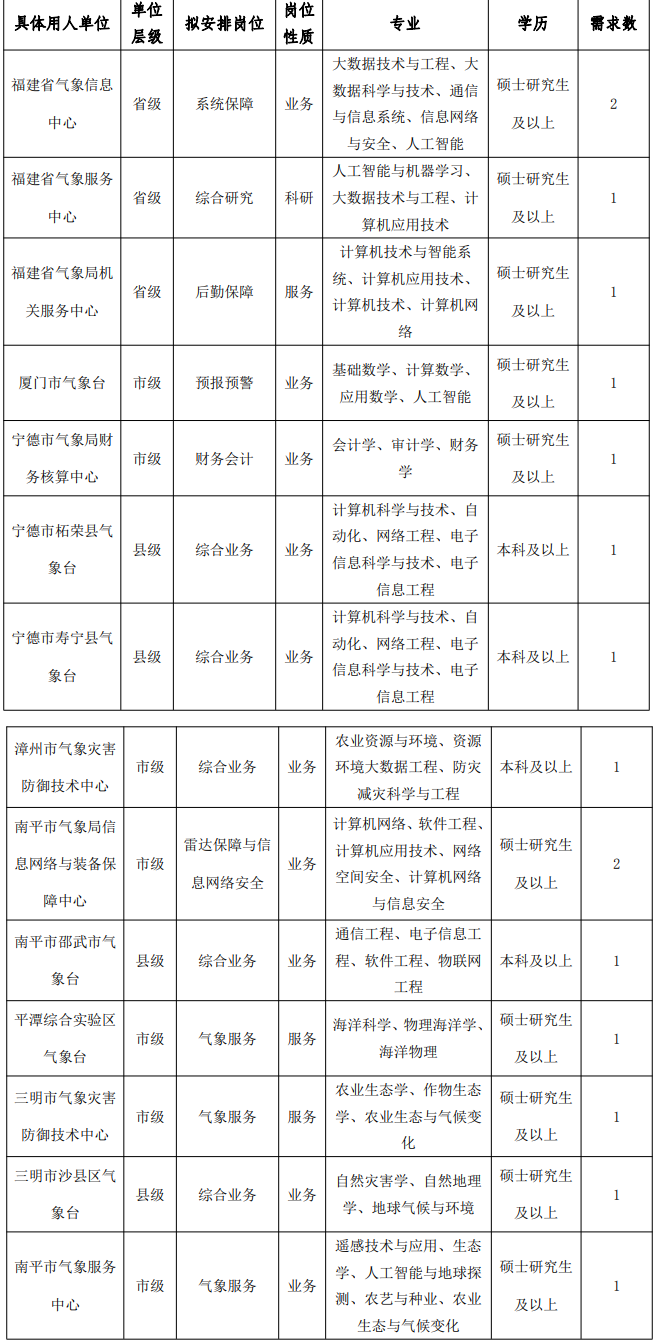 招聘信息在中国气象局网站(www.cma.gov.cn) 、气象人才招聘网(zp.cmatec.cn)、福建省气象局网站(fj.cma.gov.cn)和福建考试报名网(fjksbm.com)公开发布。