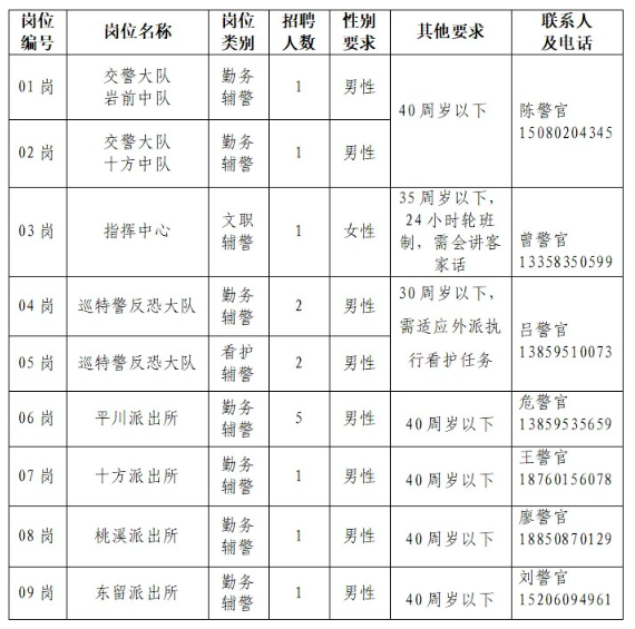 本次计划招聘辅警15名(含2名看护辅警),具体招聘岗位及要求: