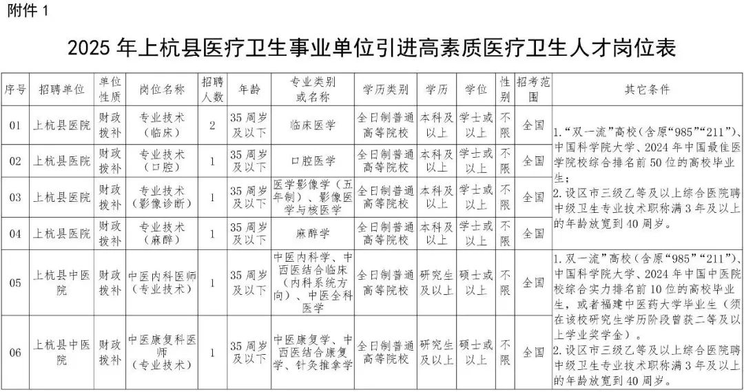 1.2025年上杭县医疗卫生事业单位引进高素质人才岗位表