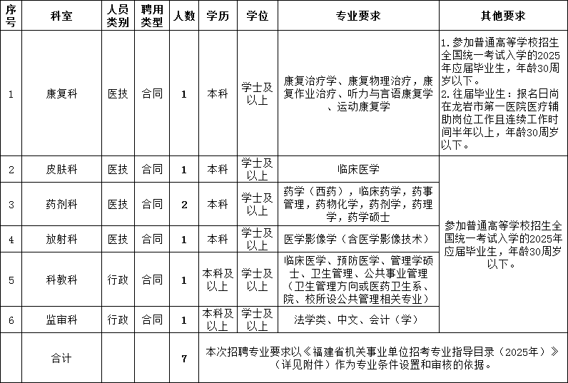 因工作需要,拟招聘医技、行政后勤岗位编外工作人员7名。具体招聘方案如下: